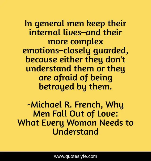 This page presents the quote "In general men keep their internal lives–and their more complex emotions–closely guarded, because either they don't understand them or they are afraid of being betrayed by them.". Author of this quote is Michael R. French, Why Men Fall Out of Love: What Every Woman Needs to Understand. This quote is about men-and-emotion, men-and-their-emotions, why-men-fall-out-of-love, men, quotes-about-men-and-love, internal-lives, complex-emotion,.