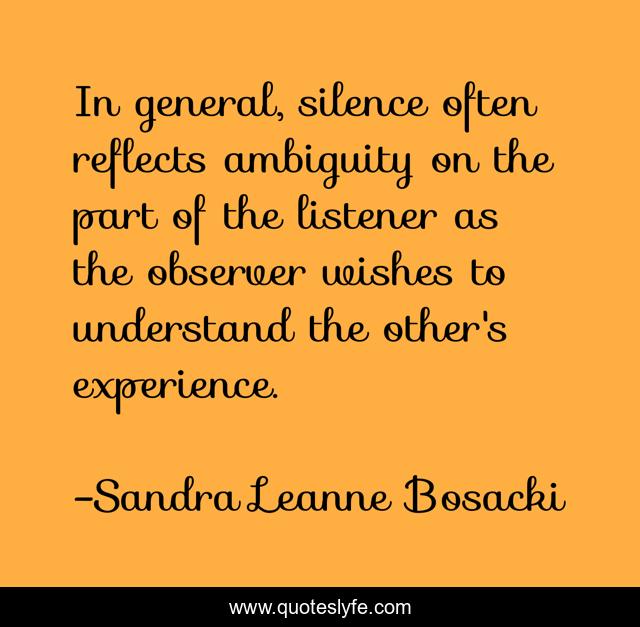 This page presents the quote "In general, silence often reflects ambiguity on the part of the listener as the observer wishes to understand the other's experience.". Author of this quote is Sandra Leanne Bosacki. .