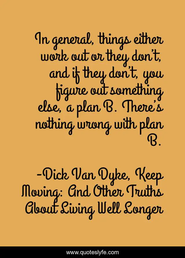 This page presents the quote "In general, things either work out or they don’t, and if they don’t, you figure out something else, a plan B. There’s nothing wrong with plan B.". Author of this quote is Dick Van Dyke, Keep Moving: And Other Truths About Living Well Longer. This quote is about life-and-living, plans, plan-b,.