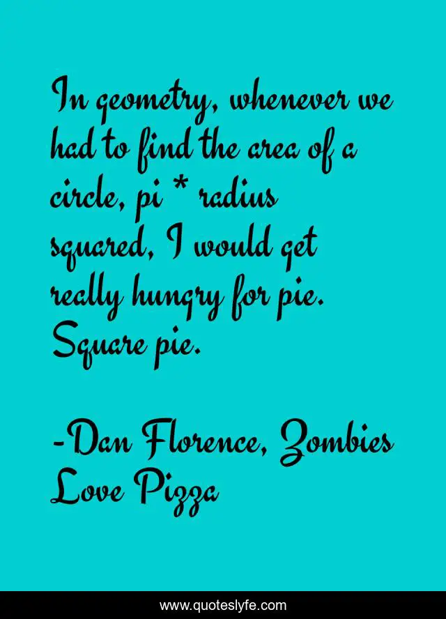 This page presents the quote "In geometry, whenever we had to find the area of a circle, pi * radius squared, I would get really hungry for pie. Square pie.". Author of this quote is Dan Florence, Zombies Love Pizza. This quote is about humor, food, pie, geometry, eating, comedy, math,.