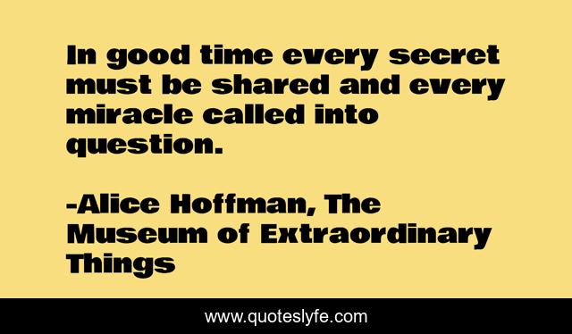 This page presents the quote "In good time every secret must be shared and every miracle called into question.". Author of this quote is Alice Hoffman, The Museum of Extraordinary Things. This quote is about secret, miracle,.