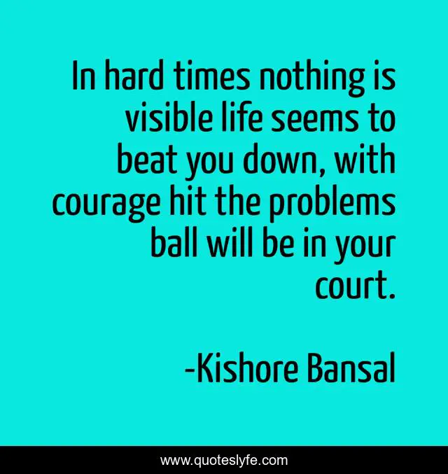 This page presents the quote "In hard times nothing is visible life seems to beat you down, with courage hit the problems ball will be in your court.". Author of this quote is Kishore Bansal. This quote is about hard-times, visible, problem, courage,.