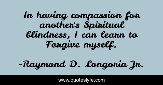 This page presents the quote "In having compassion for another's Spiritual blindness, I can learn to Forgive myself.". Author of this quote is Raymond D. Longoria Jr.. This quote is about inspiring, kindness, belief, compassion, spiritual, meaning, prayer, trust, forgiveness,.