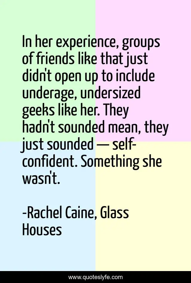 This page presents the quote "In her experience, groups of friends like that just didn't open up to include underage, undersized geeks like her. They hadn't sounded mean, they just sounded — self-confident. Something she wasn't.". Author of this quote is Rachel Caine, Glass Houses. This quote is about shy, confidence, lonely, self-esteem,.