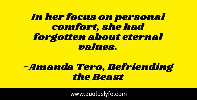 This page presents the quote "In her focus on personal comfort, she had forgotten about eternal values.". Author of this quote is Amanda Tero, Befriending the Beast. This quote is about eternal, comfort, values,.