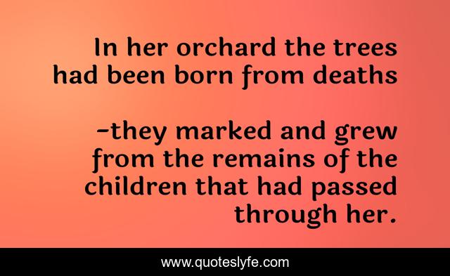 "they marked and grew from the remains of the children that had passed through her. Quotes." Quoteslyfe.com, 2025. Mon. 08 Dec. 2025. <https://www.quoteslyfe.com/quote/In-her-orchard-the-trees-had-been-224795>.