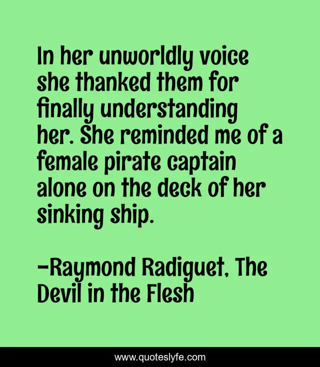 This page presents the quote "In her unworldly voice she thanked them for finally understanding her. She reminded me of a female pirate captain alone on the deck of her sinking ship.". Author of this quote is Raymond Radiguet, The Devil in the Flesh. This quote is about sinking-ship, female-insanity, insanity,.