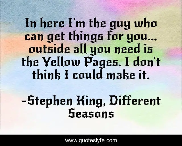 This page presents the quote "In here I'm the guy who can get things for you... outside all you need is the Yellow Pages. I don't think I could make it.". Author of this quote is Stephen King, Different Seasons. This quote is about freedom, prison,.