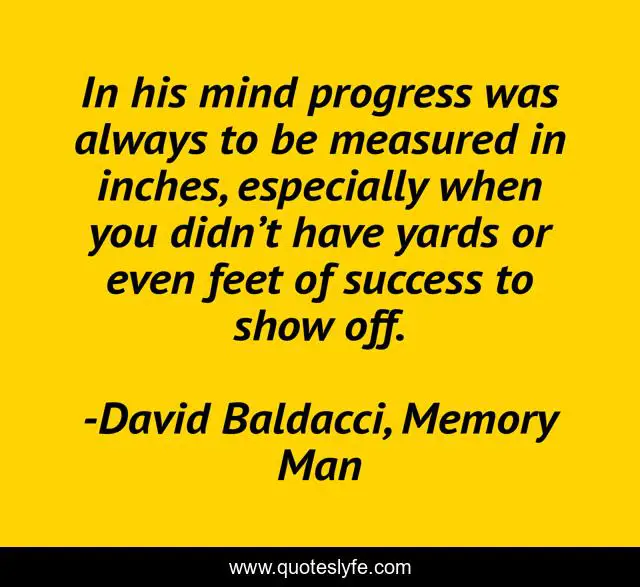 This page presents the quote "In his mind progress was always to be measured in inches, especially when you didn’t have yards or even feet of success to show off.". Author of this quote is David Baldacci, Memory Man. This quote is about progress, football, success,.