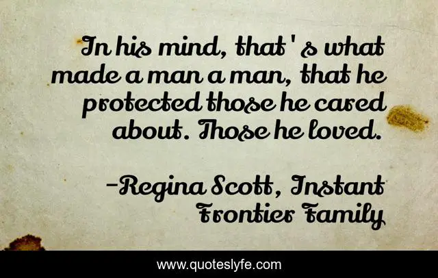 This page presents the quote "In his mind, that's what made a man a man, that he protected those he cared about. Those he loved.". Author of this quote is Regina Scott, Instant Frontier Family. This quote is about protect, love, affection, man,.