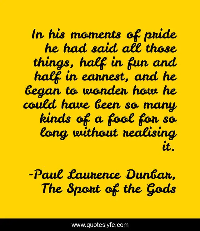 This page presents the quote "In his moments of pride he had said all those things, half in fun and half in earnest, and he began to wonder how he could have been so many kinds of a fool for so long without realising it.". Author of this quote is Paul Laurence Dunbar, The Sport of the Gods. This quote is about pride, self-awareness,.