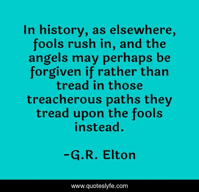This page presents the quote "In history, as elsewhere, fools rush in, and the angels may perhaps be forgiven if rather than tread in those treacherous paths they tread upon the fools instead.". Author of this quote is G.R. Elton. This quote is about fools, history,.