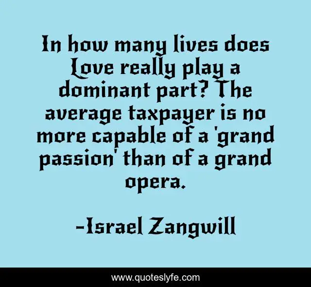 This page presents the quote "In how many lives does Love really play a dominant part? The average taxpayer is no more capable of a 'grand passion' than of a grand opera.". Author of this quote is Israel Zangwill. This quote is about love, affection,.