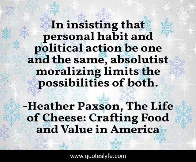 This page presents the quote "In insisting that personal habit and political action be one and the same, absolutist moralizing limits the possibilities of both.". Author of this quote is Heather Paxson, The Life of Cheese: Crafting Food and Value in America. This quote is about absolutism, habitus, morals, politics,.