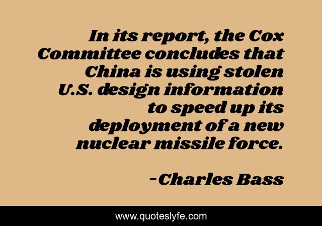 This page presents the quote "In its report, the Cox Committee concludes that China is using stolen U.S. design information to speed up its deployment of a new nuclear missile force.". Author of this quote is Charles Bass. This quote is about information, speed,.
