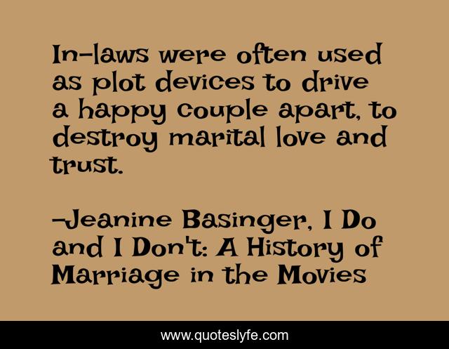 This page presents the quote "In-laws were often used as plot devices to drive a happy couple apart, to destroy marital love and trust.". Author of this quote is Jeanine Basinger, I Do and I Don't: A History of Marriage in the Movies. .