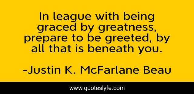 This page presents the quote "In league with being graced by greatness, prepare to be greeted, by all that is beneath you.". Author of this quote is Justin K. McFarlane Beau. This quote is about league, hardship, glory, irony, greeting, preparation, tested, underhand, forged,.