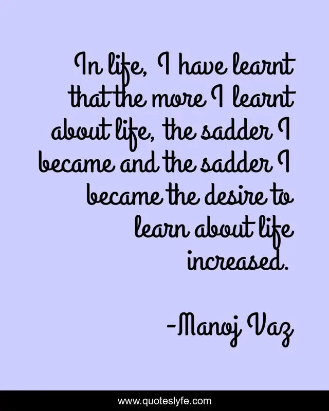 This page presents the quote "In life, I have learnt that the more I learnt about life, the sadder I became and the sadder I became the desire to learn about life increased.". Author of this quote is Manoj Vaz. This quote is about desire, living, life,.