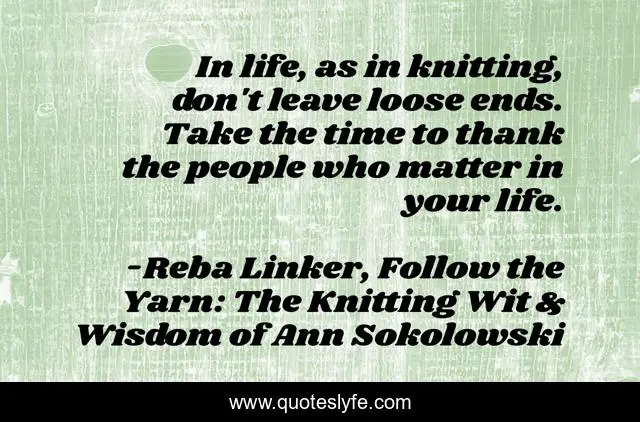 This page presents the quote "In life, as in knitting, don't leave loose ends. Take the time to thank the people who matter in your life.". Author of this quote is Reba Linker, Follow the Yarn: The Knitting Wit & Wisdom of Ann Sokolowski. This quote is about gratitude, philosophy, knitting, life-lessons,.