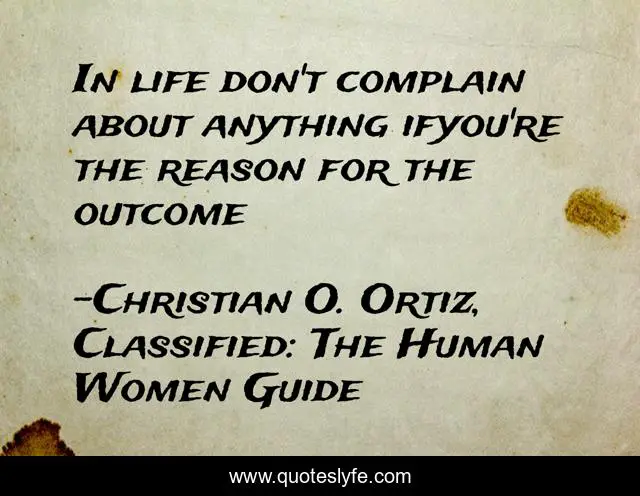 "Christian O. Ortiz, Classified: The Human Women Guide Quotes." Quoteslyfe.com, 2025. Mon. 08 Dec. 2025. <https://www.quoteslyfe.com/quote/In-life-don-t-complain-about-anything-189731>.