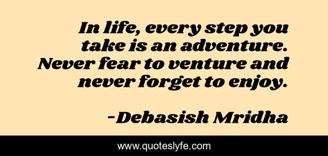 This page presents the quote "In life, every step you take is an adventure. Never fear to venture and never forget to enjoy.". Author of this quote is Debasish Mridha. This quote is about enjoy, miraboli, oscar-wilde, never-fear, adventure, philosophy, debasish-mridha, tagore, quotes,.