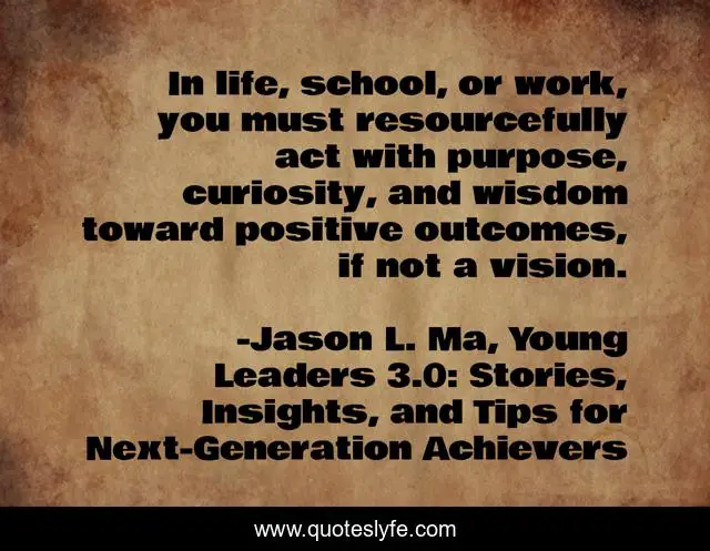 This page presents the quote "In life, school, or work, you must resourcefully act with purpose, curiosity, and wisdom toward positive outcomes, if not a vision.". Author of this quote is Jason L. Ma, Young Leaders 3.0: Stories, Insights, and Tips for Next-Generation Achievers. This quote is about life, curisosity, wisdom-thinking, work, school, wisdom, outcomes, action, positive-thinking,.
