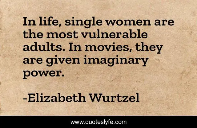 This page presents the quote "In life, single women are the most vulnerable adults. In movies, they are given imaginary power.". Author of this quote is Elizabeth Wurtzel. This quote is about movies, life, power,.