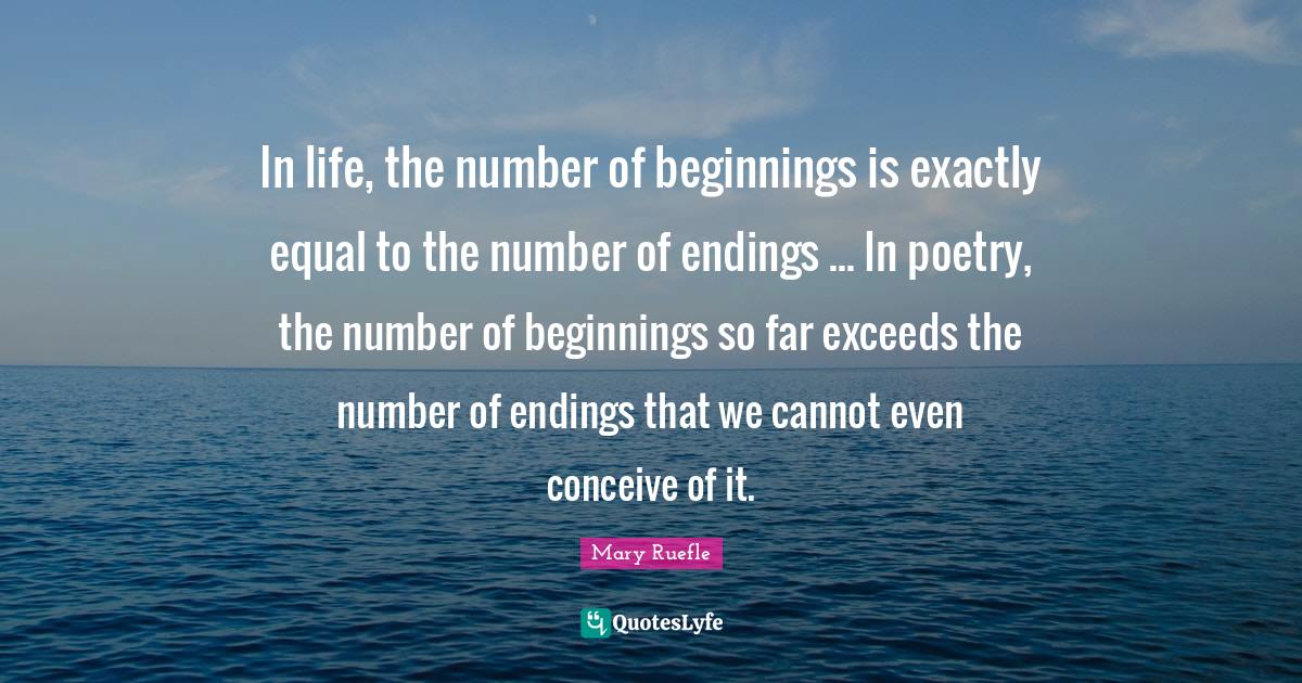 This page presents the quote "In life, the number of beginnings is exactly equal to the number of endings ... In poetry, the number of beginnings so far exceeds the number of endings that we cannot even conceive of it.". Author of this quote is Mary Ruefle. This quote is about poetry, exceed, equal, life, numbers,.