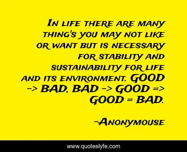 This page presents the quote "In life there are many thing's you may not like or want but is necessary for stability and sustainability for life and its environment. GOOD -> BAD, BAD -> GOOD => GOOD = BAD.". Author of this quote is Anonymouse. This quote is about balance, crimes,.