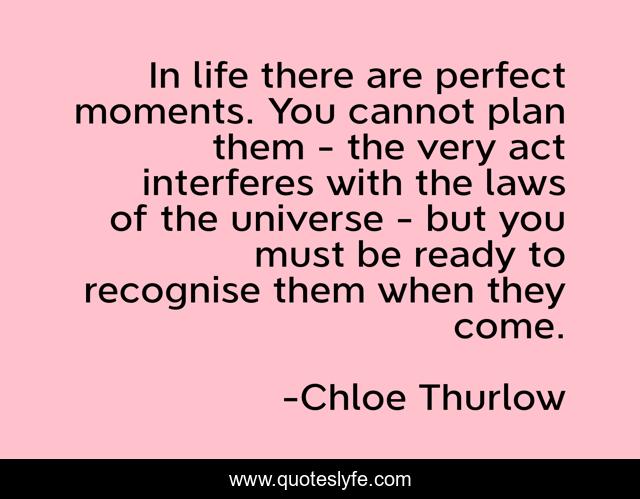 This page presents the quote "In life there are perfect moments. You cannot plan them - the very act interferes with the laws of the universe - but you must be ready to recognise them when they come.". Author of this quote is Chloe Thurlow. This quote is about perfect, perfection,.