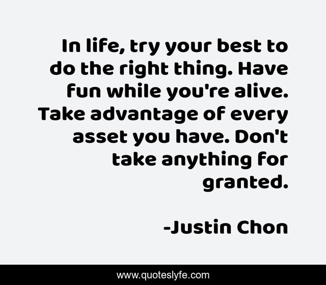 This page presents the quote "In life, try your best to do the right thing. Have fun while you're alive. Take advantage of every asset you have. Don't take anything for granted.". Author of this quote is Justin Chon. This quote is about fun, life,.