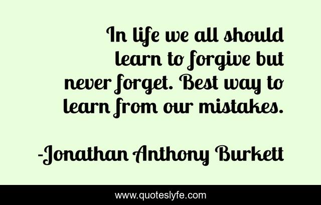 This page presents the quote "In life we all should learn to forgive but never forget. Best way to learn from our mistakes.". Author of this quote is Jonathan Anthony Burkett. This quote is about life, love, understanding-oneself-and-others, people, lessons-learned, friendship-true-and-loyal, mistakes-we-make, family-drama, lessons-in-life,.