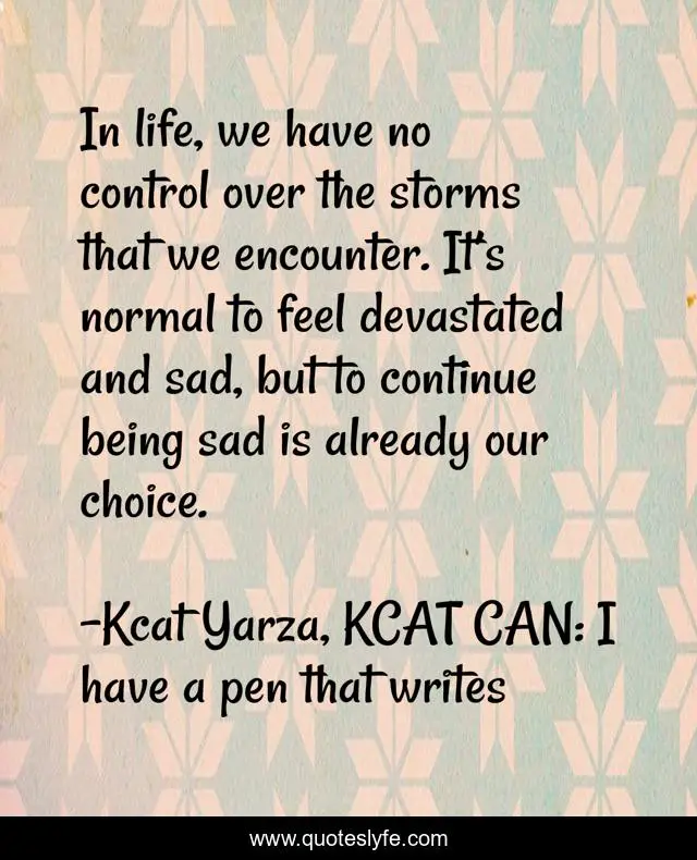 This page presents the quote "In life, we have no control over the storms that we encounter. It’s normal to feel devastated and sad, but to continue being sad is already our choice.". Author of this quote is Kcat Yarza, KCAT CAN: I have a pen that writes. This quote is about lie, confidence, positive, motivational, optimistic, inspirational, enthusiasm,.
