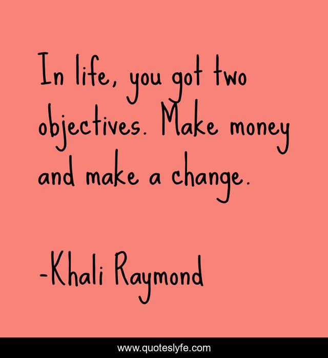 This page presents the quote "In life, you got two objectives. Make money and make a change.". Author of this quote is Khali Raymond. This quote is about money, life, change,.