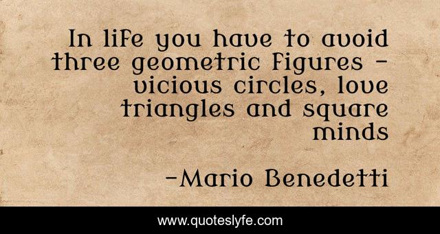 This page presents the quote "In life you have to avoid three geometric figures - vicious circles, love triangles and square minds". Author of this quote is Mario Benedetti. .