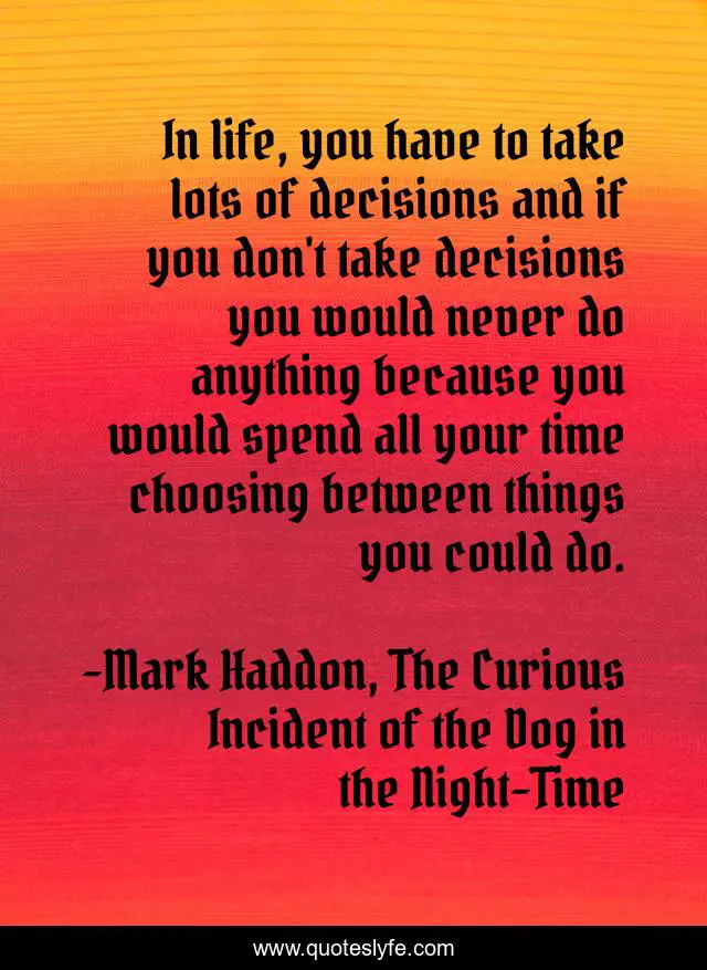 This page presents the quote "In life, you have to take lots of decisions and if you don't take decisions you would never do anything because you would spend all your time choosing between things you could do.". Author of this quote is Mark Haddon, The Curious Incident of the Dog in the Night-Time. This quote is about enthusiasm, life, decisions, inspirational,.
