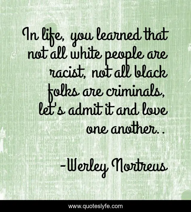 This page presents the quote "In life, you learned that not all white people are racist, not all black folks are criminals, let's admit it and love one another..". Author of this quote is Werley Nortreus. This quote is about inspirational, love, knowledge, affection, enthusiasm,.