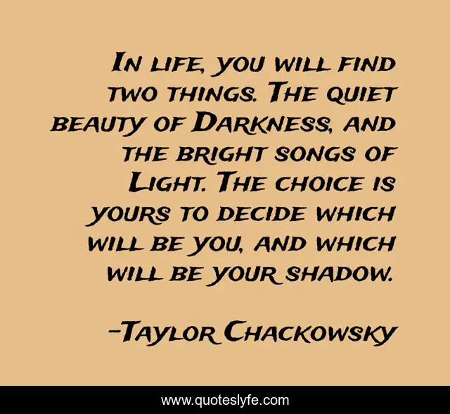 This page presents the quote "In life, you will find two things. The quiet beauty of Darkness, and the bright songs of Light. The choice is yours to decide which will be you, and which will be your shadow.". Author of this quote is Taylor Chackowsky. This quote is about dark, light,.