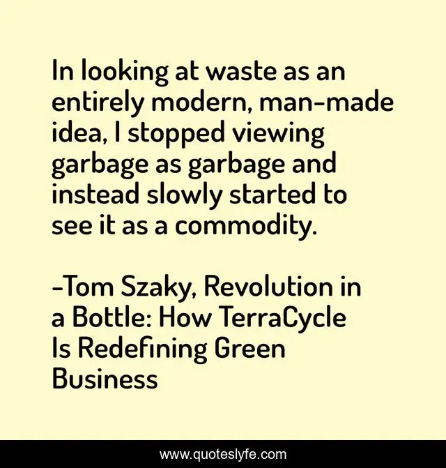 This page presents the quote "In looking at waste as an entirely modern, man-made idea, I stopped viewing garbage as garbage and instead slowly started to see it as a commodity.". Author of this quote is Tom Szaky, Revolution in a Bottle: How TerraCycle Is Redefining Green Business. This quote is about environmentalism, business, entrepreneurship,.