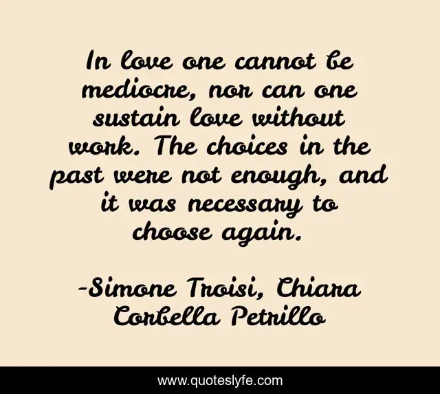 This page presents the quote "In love one cannot be mediocre, nor can one sustain love without work. The choices in the past were not enough, and it was necessary to choose again.". Author of this quote is Simone Troisi, Chiara Corbella Petrillo. This quote is about past, work, love, affection, choices,.