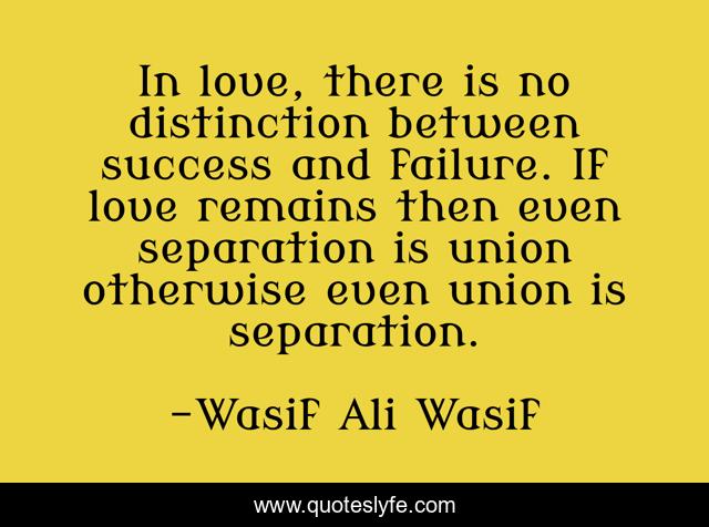 This page presents the quote "In love, there is no distinction between success and failure. If love remains then even separation is union otherwise even union is separation.". Author of this quote is Wasif Ali Wasif. This quote is about mysticism, sufi-wisdom,.