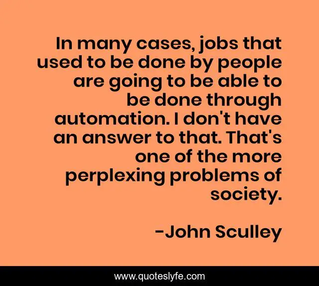 This page presents the quote "In many cases, jobs that used to be done by people are going to be able to be done through automation. I don't have an answer to that. That's one of the more perplexing problems of society.". Author of this quote is John Sculley. This quote is about problems, done, people,.