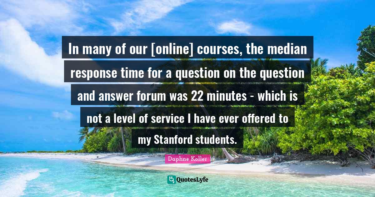 This page presents the quote "In many of our [online] courses, the median response time for a question on the question and answer forum was 22 minutes - which is not a level of service I have ever offered to my Stanford students.". Author of this quote is Daphne Koller. This quote is about online, motivation, time, courses, students, response, questions and answers, median, minutes,.