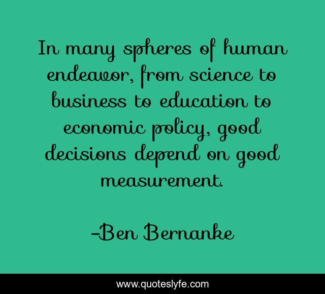 This page presents the quote "In many spheres of human endeavor, from science to business to education to economic policy, good decisions depend on good measurement.". Author of this quote is Ben Bernanke. This quote is about science, good, education,.