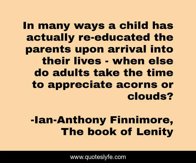 This page presents the quote "In many ways a child has actually re-educated the parents upon arrival into their lives - when else do adults take the time to appreciate acorns or clouds?". Author of this quote is Ian-Anthony Finnimore, The book of Lenity. This quote is about spiritual-growth, soul, esoteric-wisdom, spirituality, awakening, new-thought,.