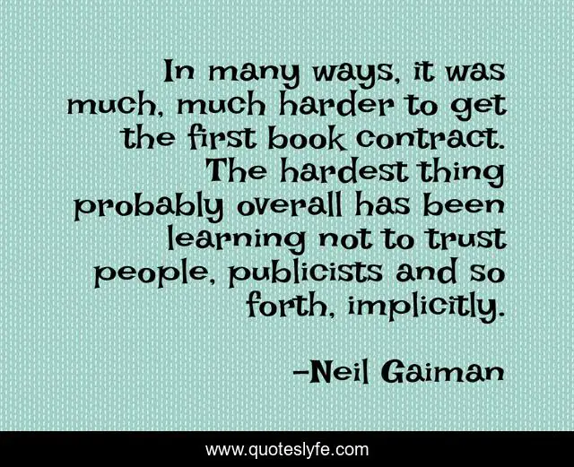 This page presents the quote "In many ways, it was much, much harder to get the first book contract. The hardest thing probably overall has been learning not to trust people, publicists and so forth, implicitly.". Author of this quote is Neil Gaiman. This quote is about book, learning, people,.