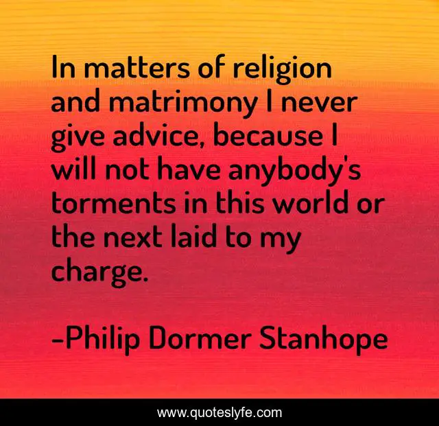 This page presents the quote "In matters of religion and matrimony I never give advice, because I will not have anybody's torments in this world or the next laid to my charge.". Author of this quote is Philip Dormer Stanhope. This quote is about religion, advice, matrimony, humor, torments,.