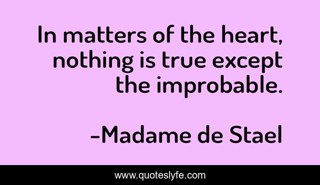 This page presents the quote "In matters of the heart, nothing is true except the improbable.". Author of this quote is Madame de Stael. This quote is about heart, true, matters,.