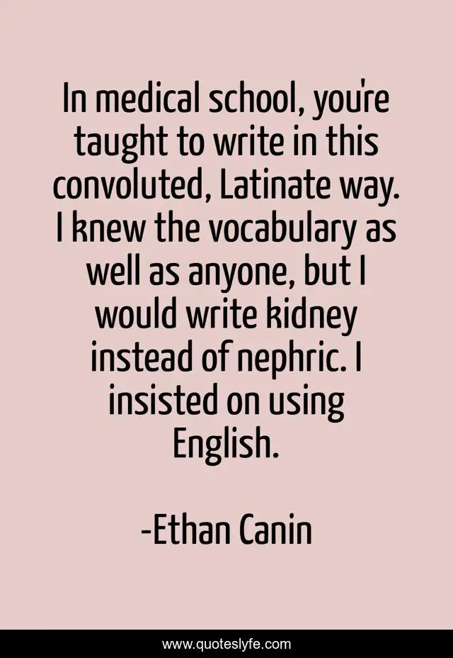 This page presents the quote "In medical school, you're taught to write in this convoluted, Latinate way. I knew the vocabulary as well as anyone, but I would write kidney instead of nephric. I insisted on using English.". Author of this quote is Ethan Canin. This quote is about school, way,.
