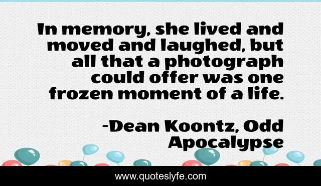 This page presents the quote "In memory, she lived and moved and laughed, but all that a photograph could offer was one frozen moment of a life.". Author of this quote is Dean Koontz, Odd Apocalypse. This quote is about photographs, dean-koontz, memory, odd-thomas, odd-apocalypse,.